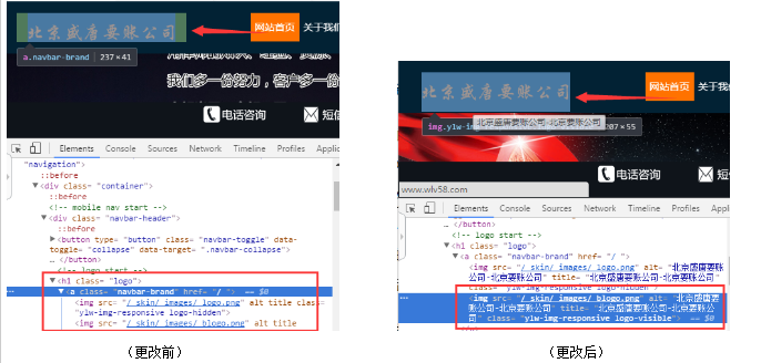 其次我们对网站进行站内调整。首先我们在网页中按f12进行简单调试及观察,主要是查看网站中的图片alt属性有没有完善,如果没有我们会将网站中的图片进行增加alt属性,我们发现的第一个没有增加alt属性的图片就是网站中的logo图片,logo图片在整个网站中是最重要的一个图片,因为百度在抓取的时候第一个抓取到的网站就是我们网站中的logo图片,所以他的重要性可想而知。发现该问题后我们对其进行更改。(如图所示)