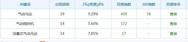气动马达这个关键词的密度已经有点过高,其他的关键词密度过低,可以通过更改网站内部标签,更新文章时尽量在题目中添加密度比较低关键词。